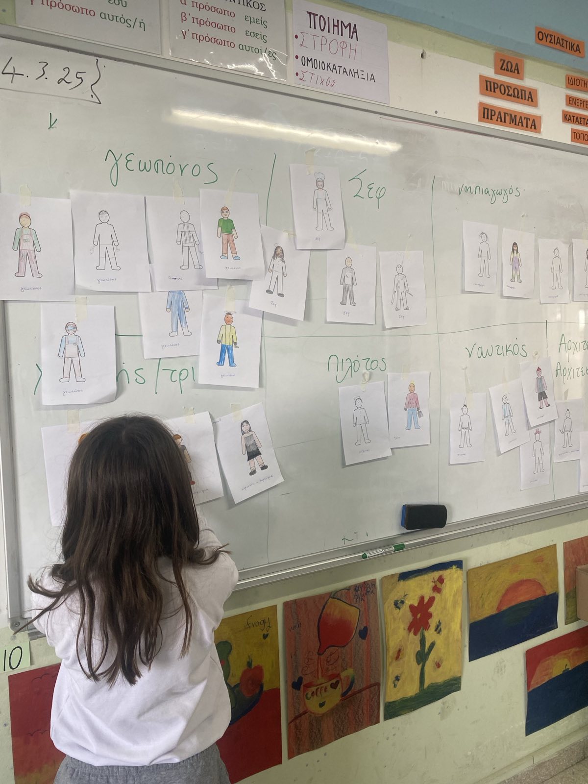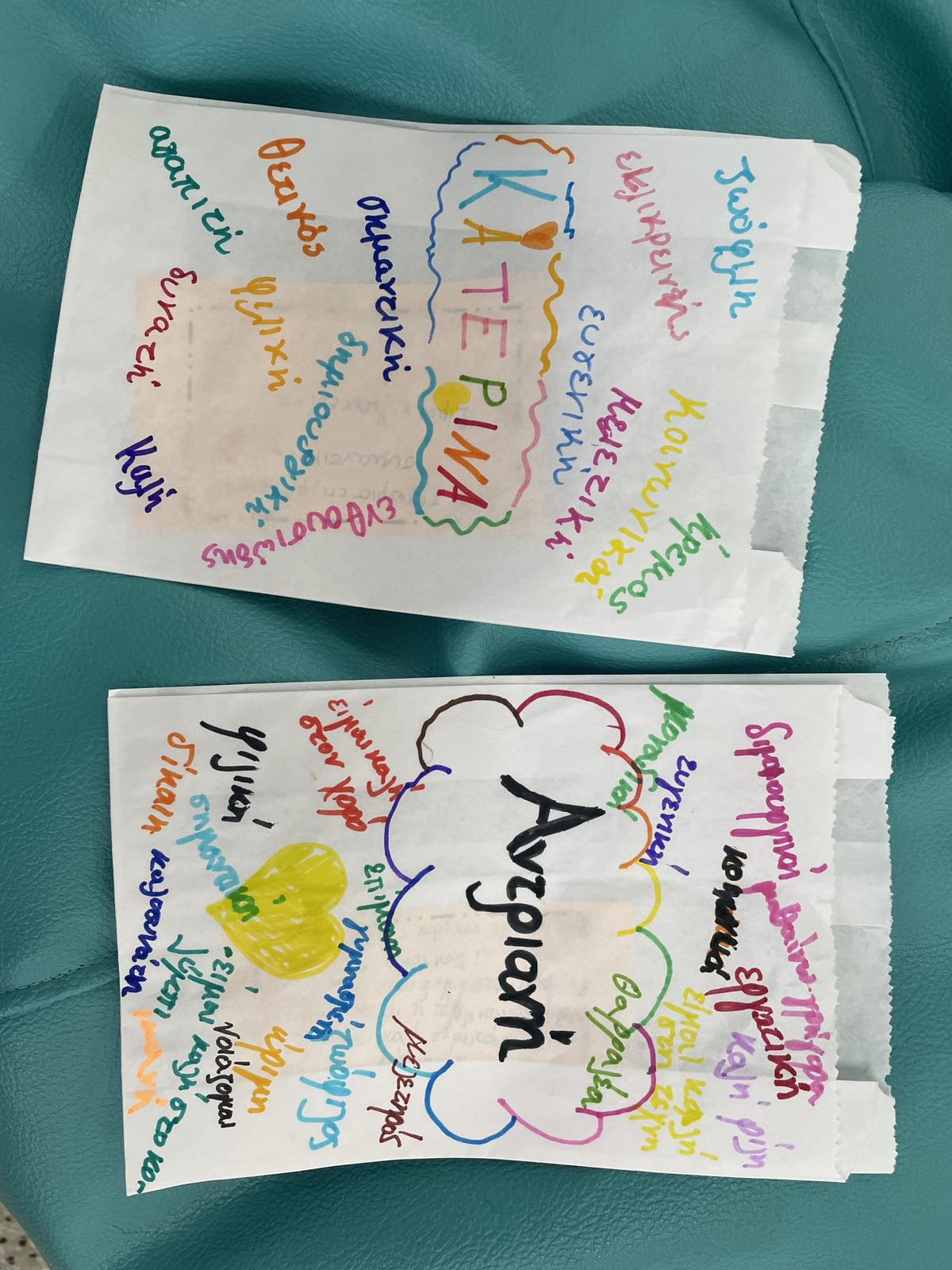 Τα παιδιά φτιάχνουν ευχετήριες κάρτες για σημαντικούς ενήλικες του σχολείου μας. Εύχονται, για παράδειγμα στην υπεύθυνη του κυλικείου μας Χρόνια Πολλά για τη γιορτή της. Επίσης εύχονται γρήγορη ανάρρωση σε εκπαιδευτικό του σχολείου μας που διδάσκει στην τάξη τους.