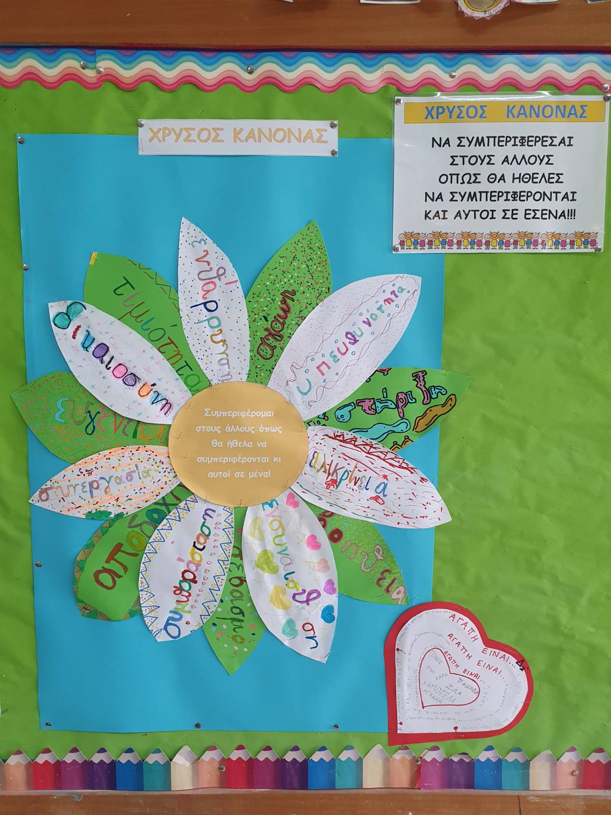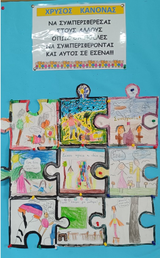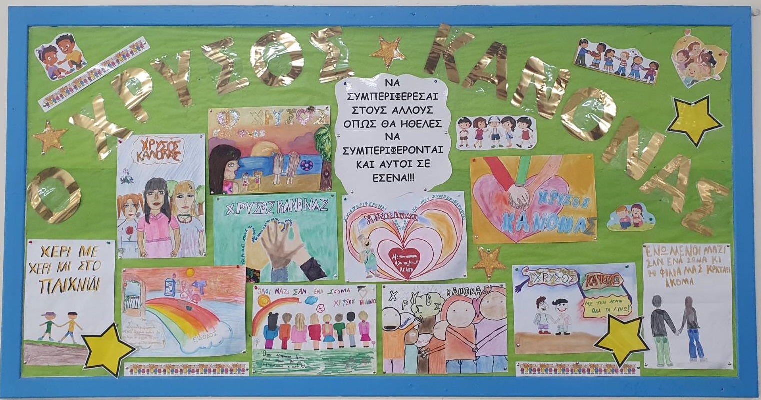 Όλοι οι εκπαιδευτικοί του σχολείου μας δίδαξαν στην τάξη τους τον «Χρυσό Κανόνα». Ο Χρυσός Κανόνας λέει πως «Συμπεριφέρομαι στους άλλους όπως θέλω να συμπεριφέρονται κι αυτοί σε εμένα». Έγινε συζήτηση στην τάξη και δόθηκαν παραδείγματα εφαρμογής αυτού του κανόνα στο σχολικό περιβάλλον. Τα παιδιά έκαναν διάφορες εργασίες με θέμα τον Χρυσό Κανόνα.