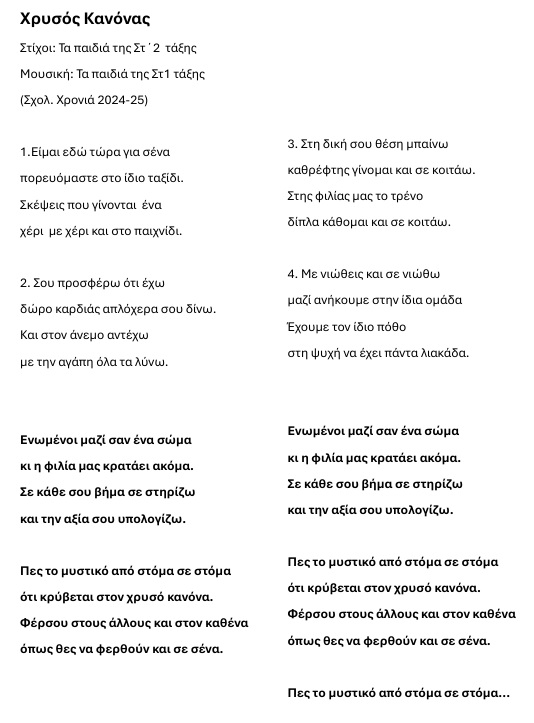 Τα παιδιά των τμημάτων Στ΄1 και Στ΄2 έγραψαν τους στίχους και τη μουσική για το τραγούδι «Χρυσός Κανόνας», με τη βοήθεια των δασκάλων τους Άννης Ακάμα και Σταύρης Νεοφύτου. Στη συνέχεια τα παιδιά ηχογράφησαν σε επαγγελματικό στούντιο το τραγούδι. Το τραγούδι διδάχθηκε σε όλα τα τμήματα του σχολείου και αποτέλεσε ένα κοινό σημείο αναφοράς για ολόκληρο το σχολείο.