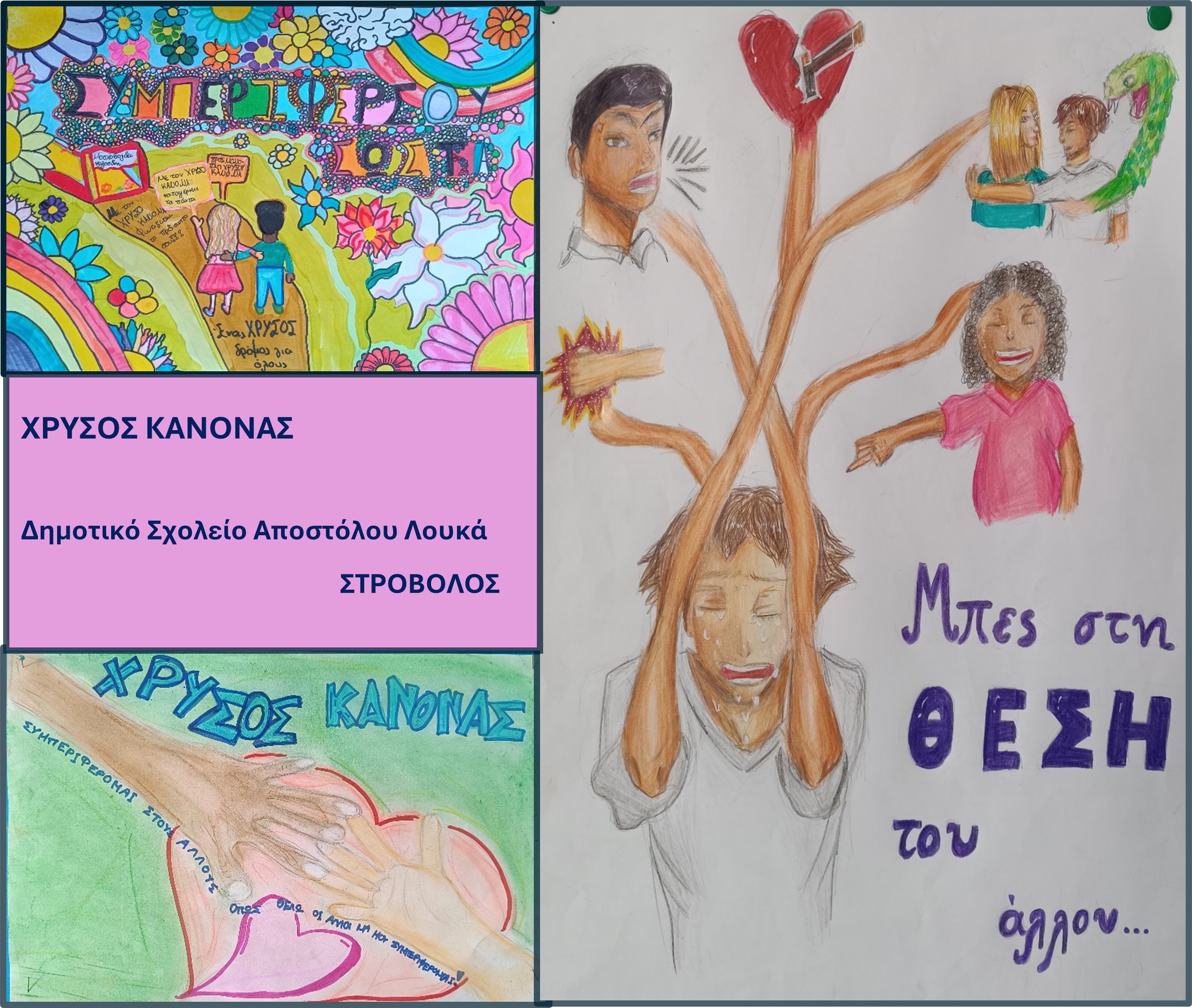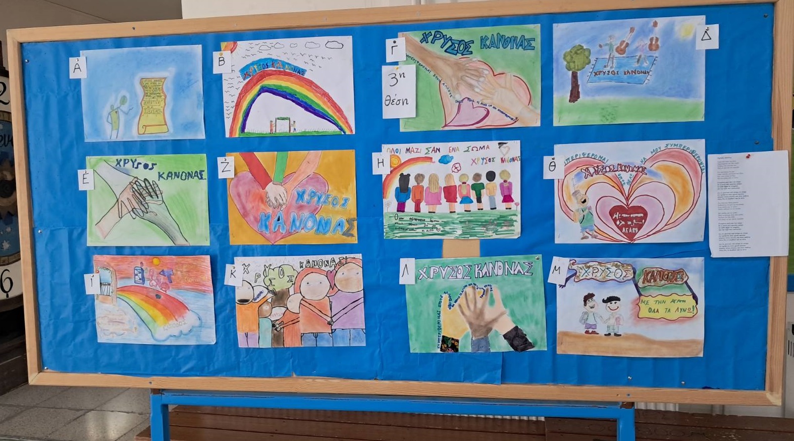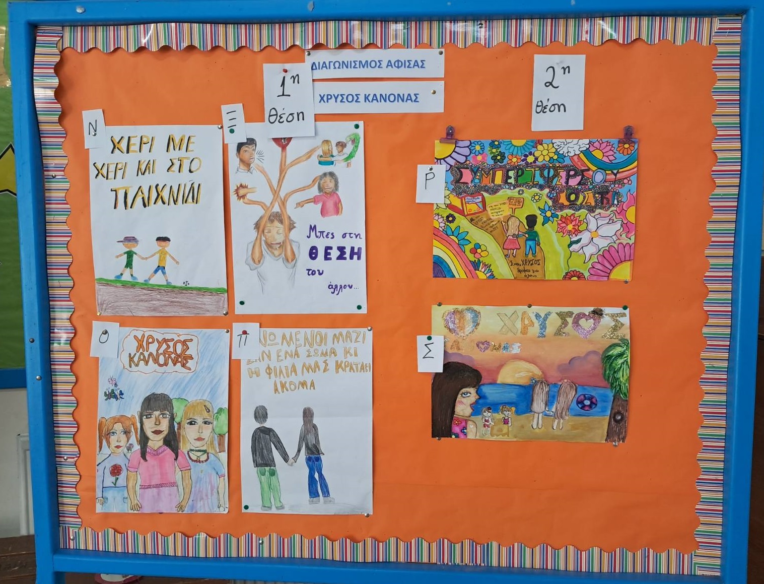 Διοργανώθηκε στο σχολείο μας Διαγωνισμός Αφίσας με θέμα τον Χρυσό Κανόνα. Στο διαγωνισμό έλαβαν μέρος τα παιδιά της Ε΄και Στ΄τάξης. Οι εκπαιδευτικοί μαζί με το μαθητικό συμβούλιο ψήφισαν για να αναδείξουν τη νικήτρια αφίσα. Δόθηκαν βραβεία και διπλώματα συμμετοχής σε όλα τα παιδιά που συμμετείχαν.